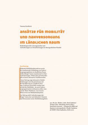 Dieser Beitrag zeigt alternative Mobilitätslösungen auf, die gemeinsam mit der Bevölkerung im Landkreis Freyung-Grafenau entwickelt wurden und sowohl die Mobilitäts- als auch Nahversorgungssituation verbessern sollen: eine „Suche-Biete-Plattform“, ein Gemeindebus sowie ein Mitfahrbanksystem. Der Beitrag stellt Anforderungen der Bürger*innen dar und diskutiert Chancen und Hemmnisse neuer Mobilitätsangebote.