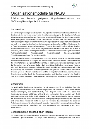 Die Einführung Neuartiger Sanitärsysteme (NASS) im ländlichen Raum ist maßgeblich von der Bereitschaft der zentralen Akteure wie den Abwasserentsorgern, der Landwirtschaft, den Bürger*innen oder auch den politischen Entscheidungsträgern abhängig. Darüber hinaus benötigt deren erfolgreiche Realisierung einen strukturellen Rahmen, der Veränderungen bzw. Verbesserungen netzgebundener Infrastrukturanlagen dauerhaft trägt. Hierfür bietet es sich an, nach einer eingehenden Analyse der technischen und rechtlichen Möglichkeiten und der in Frage kommenden Akteure, ein geeignetes Organisationsmodell zu formulieren.