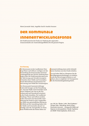In „Kommunen innovativ“ erprobten die Verbundvorhaben kreative Finanzierungsansätze. Ein interkommunaler Fonds ermöglicht es beispielsweise den Kommunen in den Landkreisen Nienburg/Weser und Gifhorn, zukünftig ihre Ortskerne attraktiv umzugestalten. Den Neubau von Gemeinbedarfseinrichtungen im Dorfzentrum, Modernisierungs- und Umbaumaßnahmen oder die attraktive Gestaltung zentraler Plätze entscheiden und finanzieren die Gemeinden nun gemeinsam. Ebenfalls im Fondsmodell, aber in anderer Ausrichtung, wurde erprobt, in wie weit ein Kleinprojektefonds dazu beitragen kann, eigeninitiatives Engagement in der Kleinstadt zu aktivieren. Bürgerinnen und Bürger, die Bedarfslücken im eigenen Alltag erleben, wurden motiviert und unterstützt, hierfür Angebote selbst zu entwickeln, die ihnen und anderen Bewohnerinnen und Bewohnern zu Gute kommen. An anderer Stelle wurden ebenfalls neue Finanzierungsinstrumente entwickelt, die bürgerschaftliches Engagement bei der Sanierung und Nachnutzung denkmalgeschützter Bausubstanz unterstützen können. Weitere Analyse in der Fördermaßnahme „Kommunen innovativ“ untersuchten kommunalfiskalische Effekte von Multilokalität – also dem Kurz- und Langzeitpendeln von Teilen der Bevölkerung – oder den Einsatz von Jahresabschlusskennzahlen und ihre Rolle in der Beurteilung der Nachhaltigkeit kommunaler Finanzen.